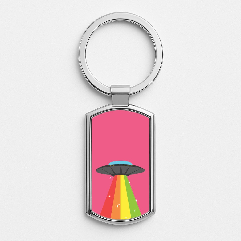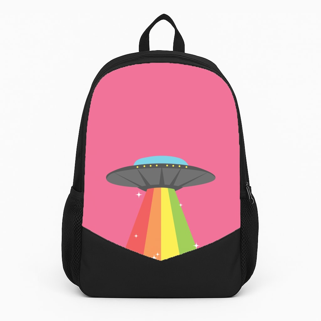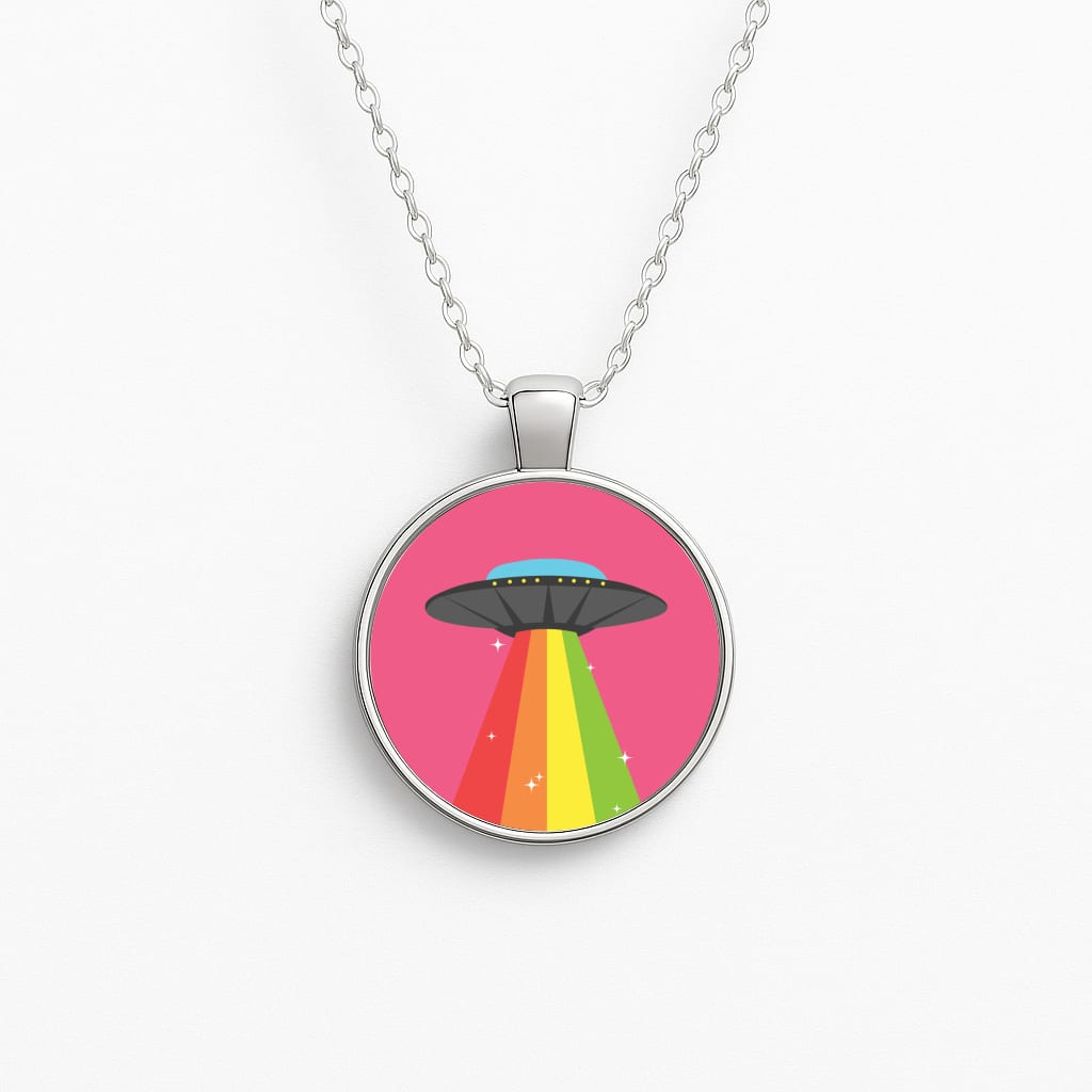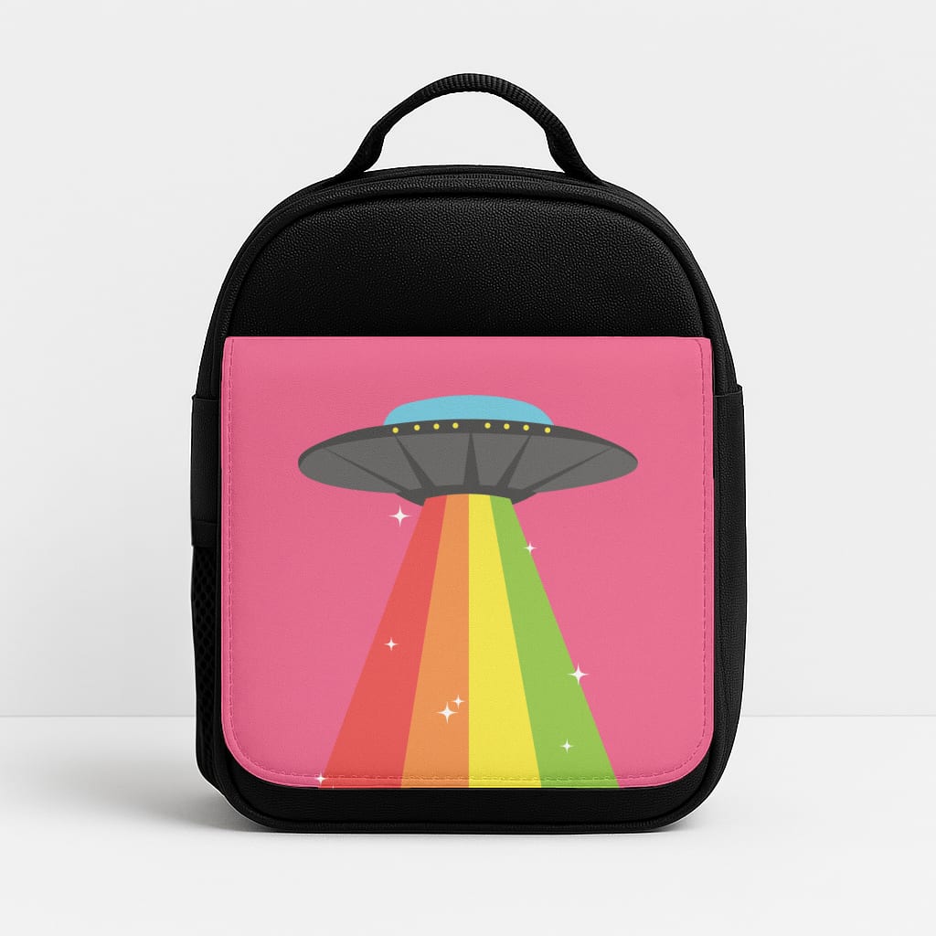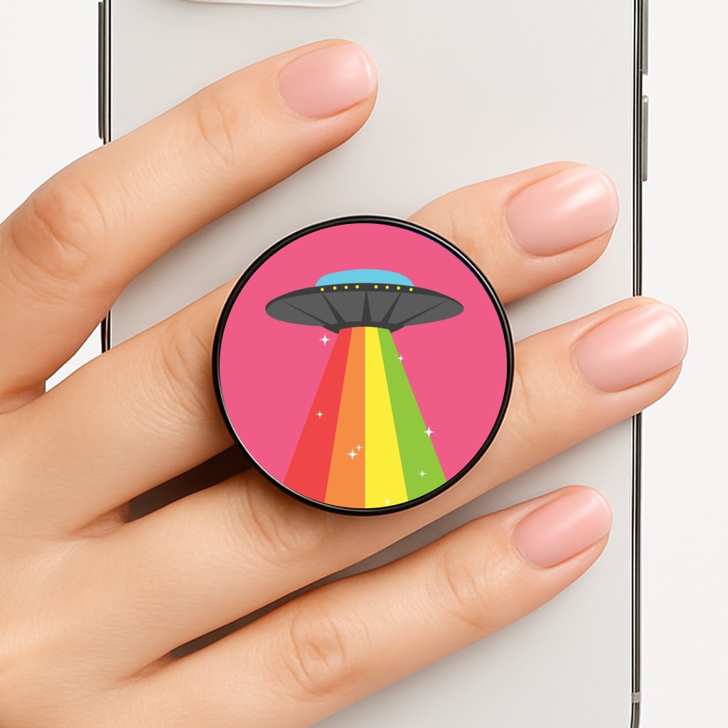 Available for a range of iPhone, Samsung Galaxy, and Google Pixel models, this case is printed on one side with a vibrant rainbow alien spaceship design, while the reverse is sleek black faux leather.